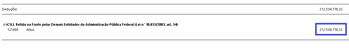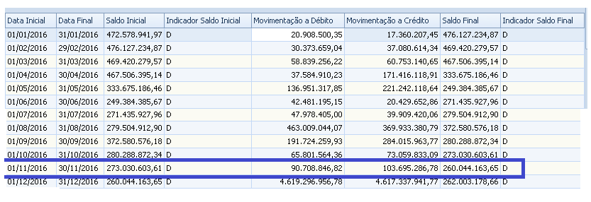 Com o parâmetro definido como "SIM", o saldo considerado na apuração de novembro será o saldo acumulado do período apurado, ou seja, apenas os valores acumulados de Janeiro a Novembro 212.534.778,32 (diferença entre a movimentação de débito e crédito):