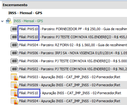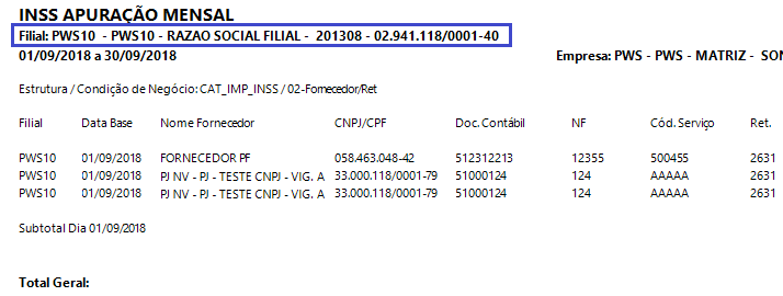 E para melhoria os relatórios da Apuração do INSS foram tratados para apresentar o Código, a Razão Social e o CNPJ da Filial no cabeçalho, quando o parâmetro geração_guia_relatório_filial estiver igual a SIM.