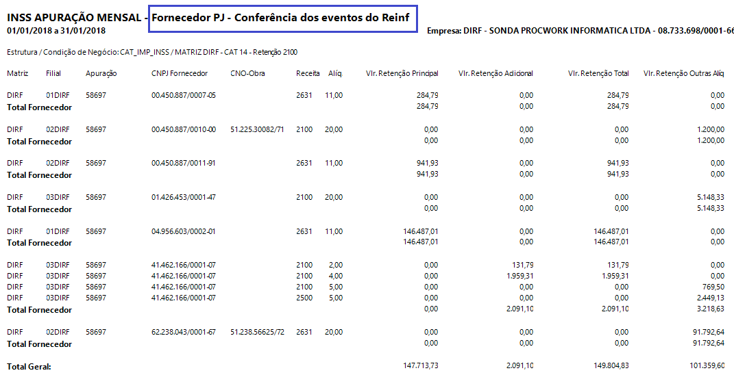 O desenvolvimento da parte, Fornecedor PJ-Conferência dos eventos do Reinf, tem como objetivo auxiliar a conferência dos dados da Apuração do INSS com os dados do relatório do evento R2010 na parte de RESUMO DAS RETENÇÕES DO INSS PARA CONFERÊNCIA COM A APURAÇÃO DOS RETIDOS.