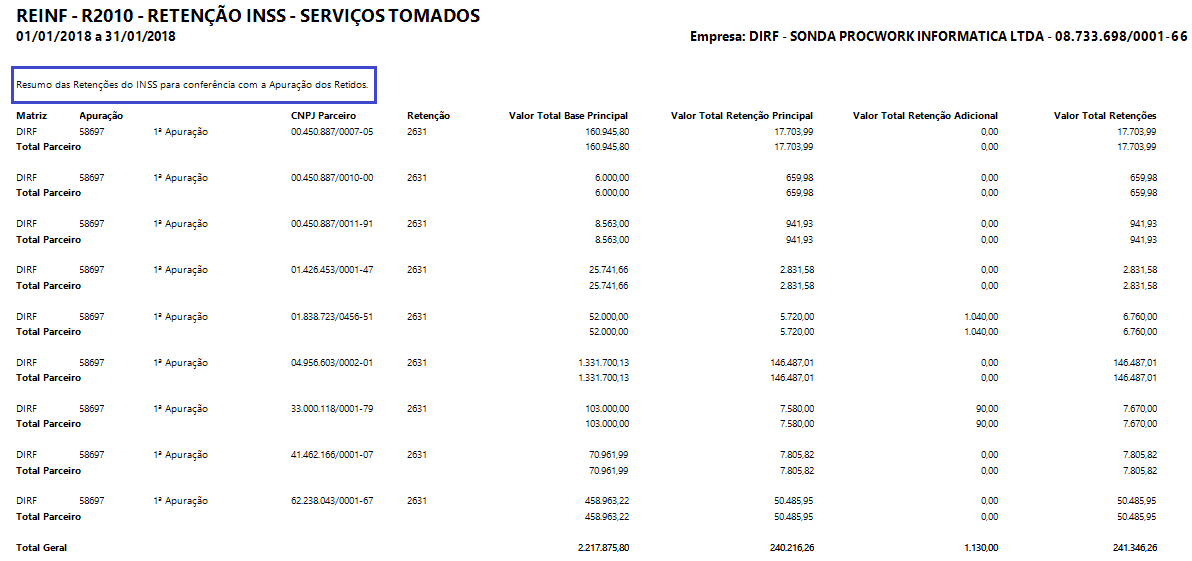 Esta parte do relatório tem como objetivo auxiliar a conferência dos dados da Apuração do INSS com os dados do relatório do evento R2010, na parte de RESUMO DAS RETENÇÕES DO INSS PARA CONFERÊNCIA COM A APURAÇÃO DOS RETIDOS.
