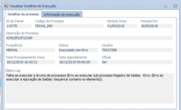 Ao solicitar o encerramento de Indiretos estava apresentando errro: Erro ao executar a Apuração de Saídas: Sequence contains no elements (Sequence contains no elementens).