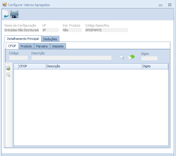 Obs.: se o campo Origem da tela estiver marcado como Energia/Telecom, somente será possível parametrizar CFOP na aba Detalhamento Principal e Deduções. As demais opções serão desabilitadas.