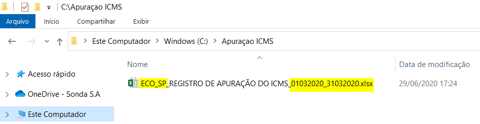 Arquivo com o novo padrão de nomenclatura salvo na máquina.