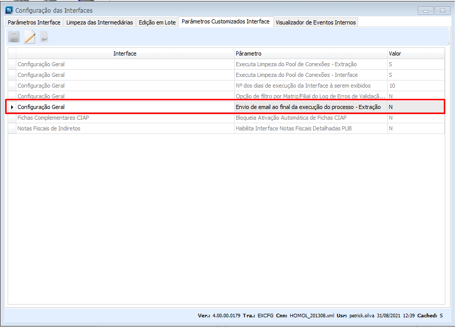 Foi implementada a opção de envio de email ao final da execução dos processos de Extração de Dados. Essa opção é parametrizada na tela de Configuração das Interfaces e já vem com o valor default marcado como “N” (Não enviar email), conforme demonstra o print abaixo: