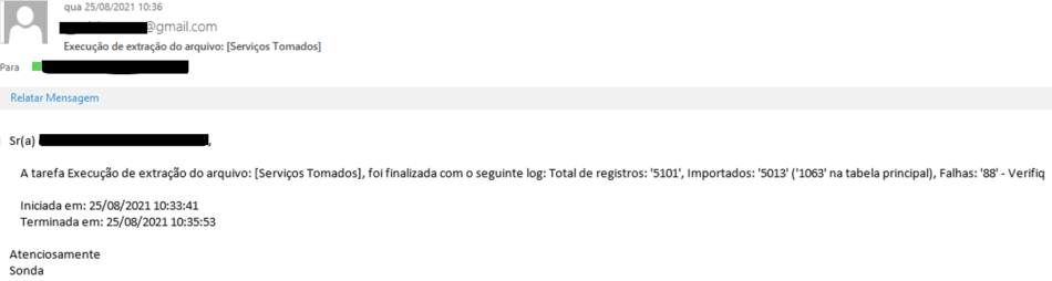 Após reiniciar o serviço Sonda, para que as tags supracitadas sejam reconhecidas pelo serviço Sonda, já é possível executar a Extração de Dados e ao seu final, é emitido um email com um modelo como o demonstrado a seguir: