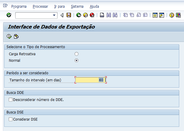 Acessar a transação /PWSATI/ZLFR015 no Menu SAP para carregar as informações de Exportação para o COMPLY: