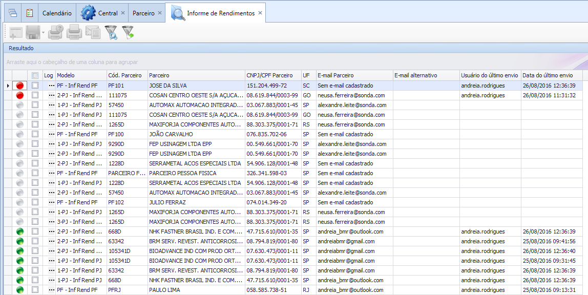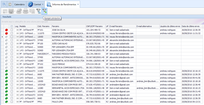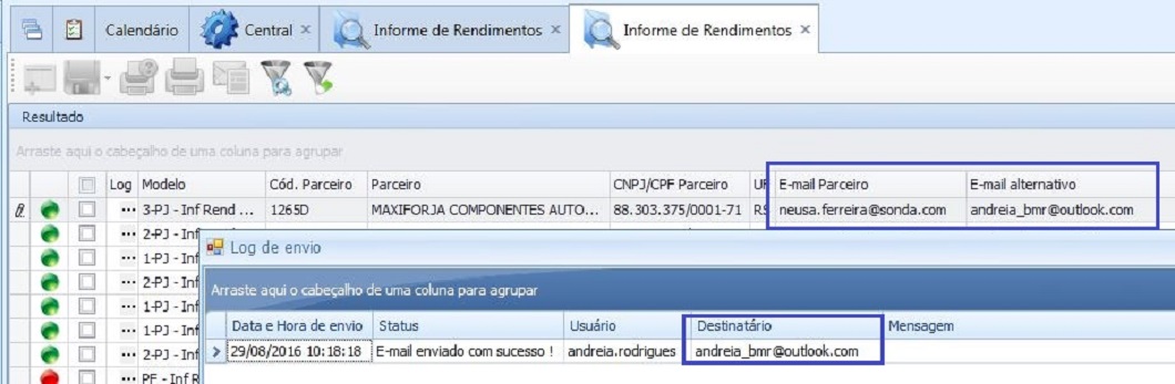 Vermelha: Informe de Rendimentos com falha no envio do e-mail.