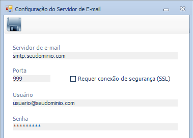 Servidor de E-mail: Informar o servidor de e-mail utilizado pela empresa. Por exemplo: smtp.seudominio.com (substitua “seudominio.com” pelo domínio que a empresa possuir).
