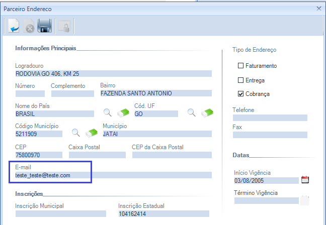 Quando o e-mail não estiver cadastrado será demonstrado nesta coluna a frase “Sem e-mail cadastrado”. O e-mail deve ser cadastrado na tela do Parceiro aba Endereço.