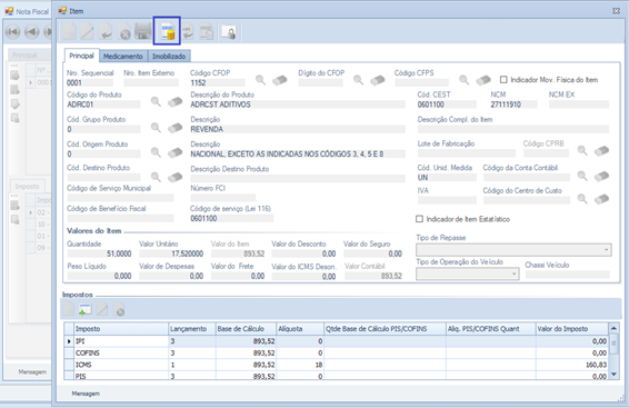 Para acessar o item Oil é necessário ir no item da Nota Fiscal e selecionar a opção ilustrada abaixo: