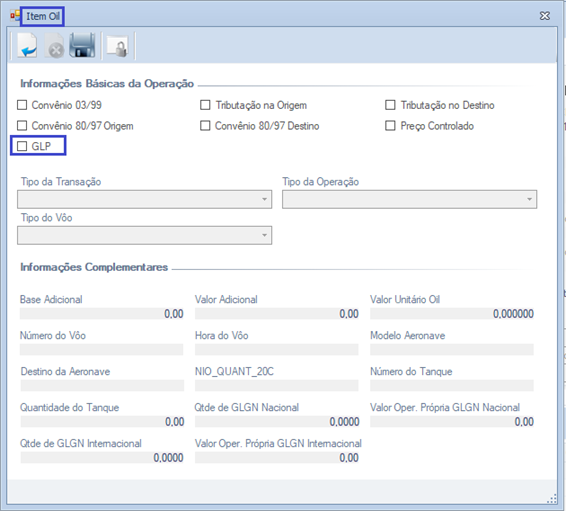 Após selecionada irá abrir a tela 'Item Oil', no qual consta o novo campo GLP, conforme abaixo: