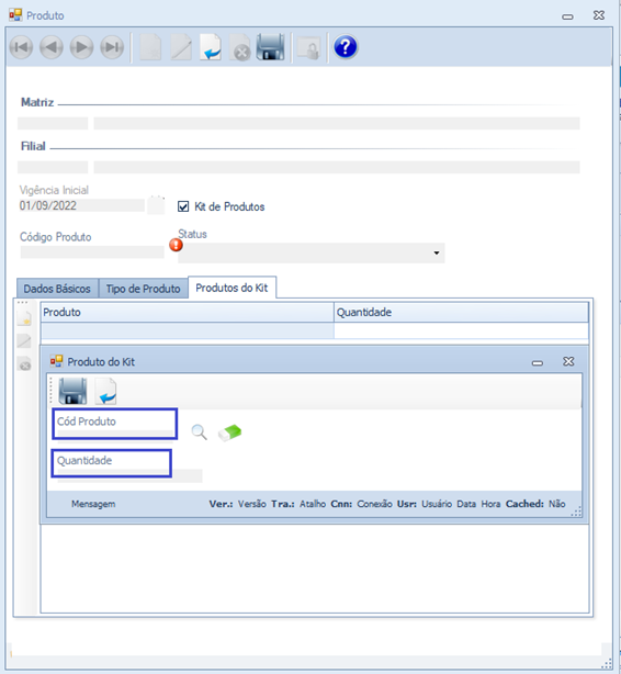 Na aba “Produtos do Kit” selecionar a opção Novo, para efetuar a inclusão de dados nos campos: “Cód. Produto” e “Quantidade”
