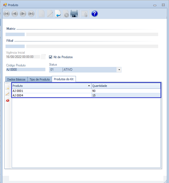 Em atendimento ao Guia Prático da EFD ICMS IPI, com vigência inicial em 01/2023 - Leiaute_Versão_017, foi criada a aba “Produtos do Kit” na tela “Produto”, com o objetivo de atender ao novo Registro 0221 (Correlação Entre Códigos de Itens Comercializados)