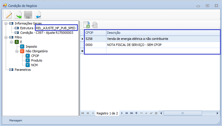 Obs: Para que os itens negativos e estatisticos sejam gerados de forma correta no relatório, todos os CFOP´s da nota fiscal, inclusive o "0000" devem ser parametrizados na condição de negócio REL_AJUSTE_NF_PUB_SPED, conforme demonstrado a seguir:
