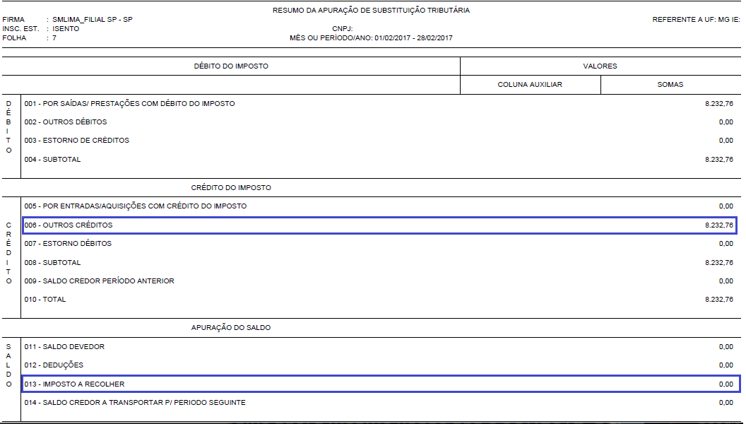 Linha de apuração: 006 (Outros Créditos) do Resumo de apuração da Substituição Tributária.