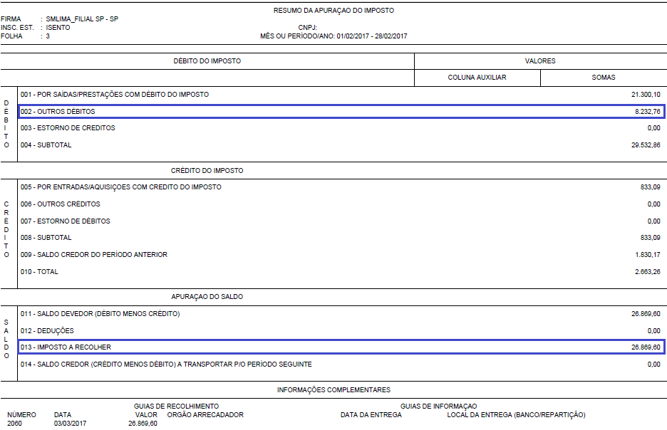 Linha de apuração: 002 (Outros Débitos) do Resumo de Apuração do ICMS.