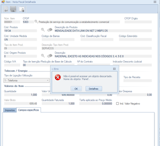 Estava ocorrendo o erro "Não é possível acessar um objeto descartado" ao editar um item com campo específico parametrizado na Tela Nota Fiscal Detalhada.