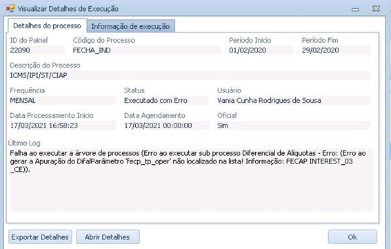 Falha ao executar a árvore de processos ( Erro ao executar sub processo Diferencial de Alíquota- Erro: ( Erro ao gerar a Apuração do DifalParâmetro ‘fecp_tp_oper’ não localizado na lista!