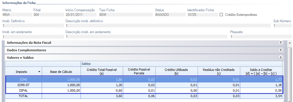 Tratamento realizado para demonstrar o valor da baixa corretamente no Modelo C quando a ficha tem mais de um imposto.