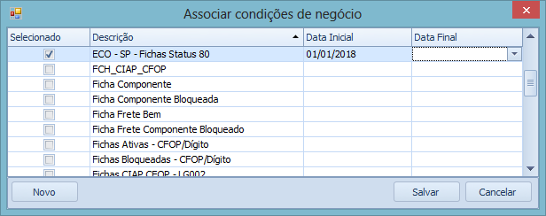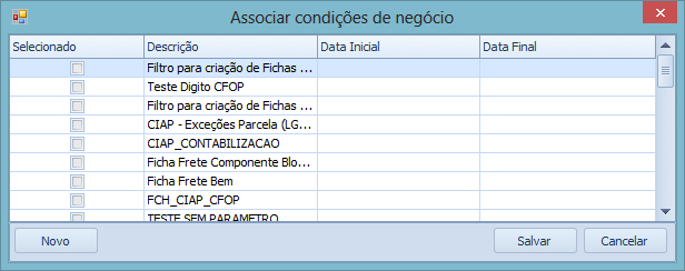 Após a criação da condição de negócio, para associar a mesma à estrutura, basta selecioná-la na tela “Associar condições de negócio”, informar a data inicial de vigência e clicar em Salvar.