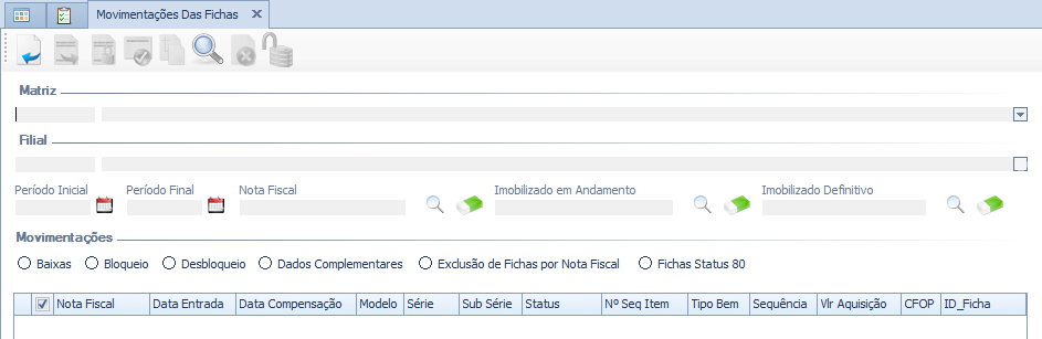 As fichas serão criadas com status 80 – Aguardando No. Imobilizado, ao executar a interface ou incluir uma nota fiscal através da tela de notas, caso a mesma possua os parâmetros definidos.