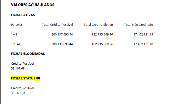 Para identificação pelo usuário do valor de crédito possível (ICMS+ICMS ST+Difal) referente as fichas com status 80, foi inserido no relatório Acompanhamento de Créditos, grupo Valores Acumulados, um subitem denominado Fichas Status 80.