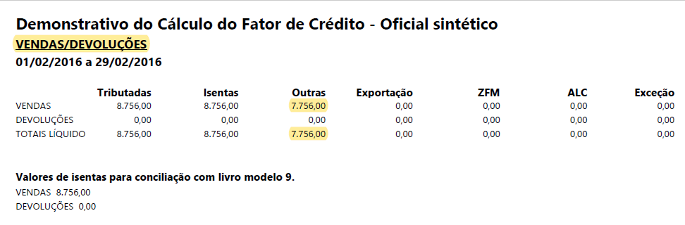 Valor de Outras Saídas é apresentado no quadro de Vendas/Devoluções para ser utilizado no cálculo do fator.