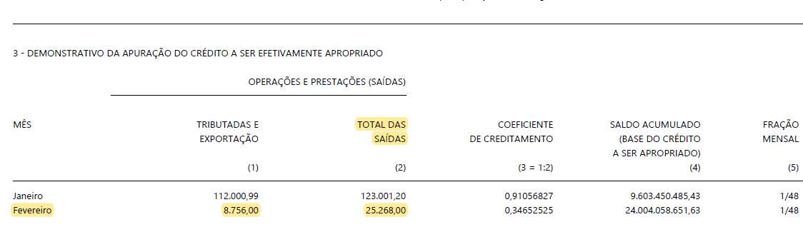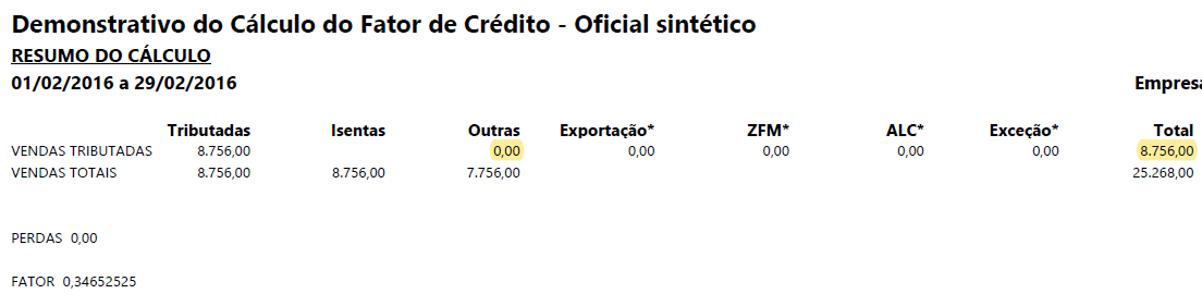 No quadro Resumo do Cálculo, ao aplicar a fórmula básica, o valor de Outras Saídas é somado apenas na linha Vendas Totais para cálculo do fator.