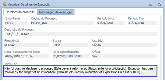 Não foi possível desfazer o processo (Este deverá retornar ao Status anterior à solicitação). Exception has been thrown by the target of an invocation. (ORA-01795: maximum number of expressions in a list is 1000).