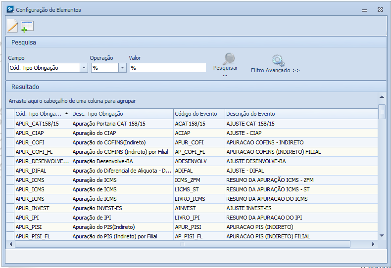 Para a inclusão de um novo 'Elemento' deve ser feito pesquisa e selecionado o 'Evento' referente às obrigações de apurações, que são as que permitem associações de ajustes manuais:
