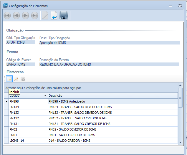 Será possível, também, nessa tela de ‘Configuração de Elementos’, editar os dados do 'Histórico' ´para elementos padrões, os que são disponibilizados pela Sonda para geração dos lançamentos de Ajustes e GUIA's automáticas e Apurações.