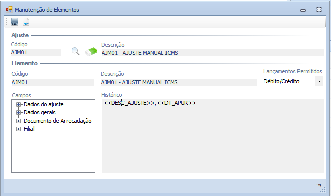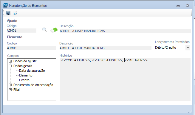 O ajuste manual, deve estar previamente cadastrado na tela de 'Código do Ajuste' no menu Cadastros Básicos > Lançamentos > Ajustes, para que seja pesquisado e selecionado, o que preencherá automaticamente os campos de 'Elemento'.