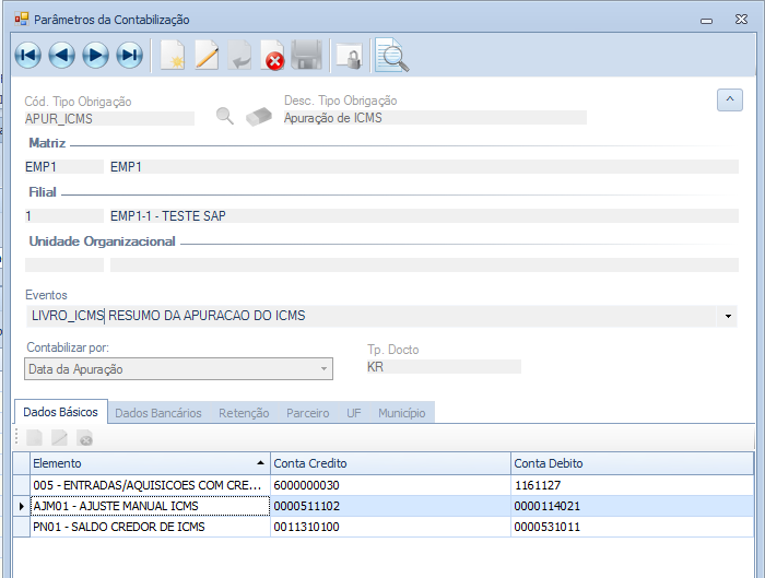 Após associar o elemento ao evento, é necessário configurar o elemento na tela de 'Parâmetros da Contabilização' para a Matriz/ Filial referente, informando as contas, chaves e centro de custo, da mesma forma que é feito para os elementos padrões, disponibilizados pela Sonda, para então, geração do lançamento: