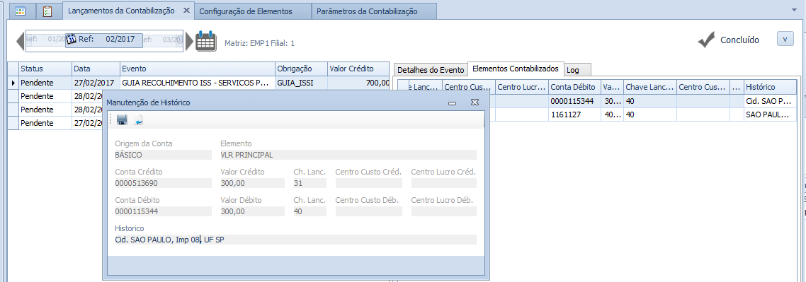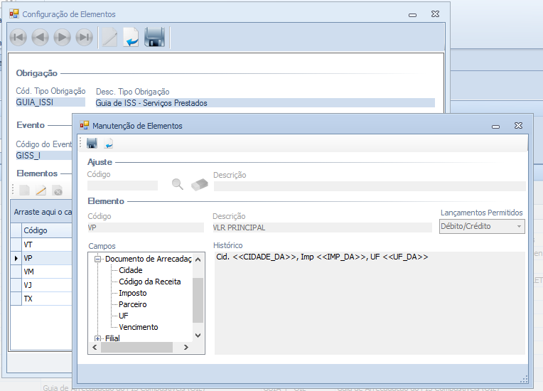 Como no exemplo acima, foi editado o elemento 'VP - VLR PRINCIPAL' do Evento de 'GISS_I - GUIA RECOLHIMENTO ISS - SERVICOS PRESTADOS', mas todos os eventos que possuem esse elemento demonstraram os mesmos dados no histórico, desde que exista o valor referente à TAG a ser gerada. Portanto quando incluídos textos, os mesmos devem ser genéricos.