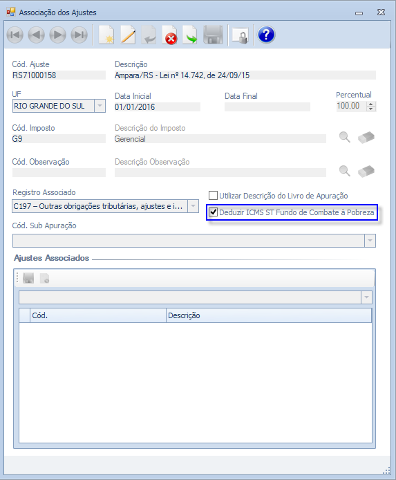 Desta forma, quando o item estiver vinculado aos ajustes, cujo o campo “Deduzir ICMS ST Fundo de Combate à Pobreza” da tela “Associação dos Ajustes” esteja marcado, será deduzido o valor do campo 07 (VL_ICMS) do registro C197 dos campos 24, 18 e 09, respectivamente dos registros C100, C170 e C190.