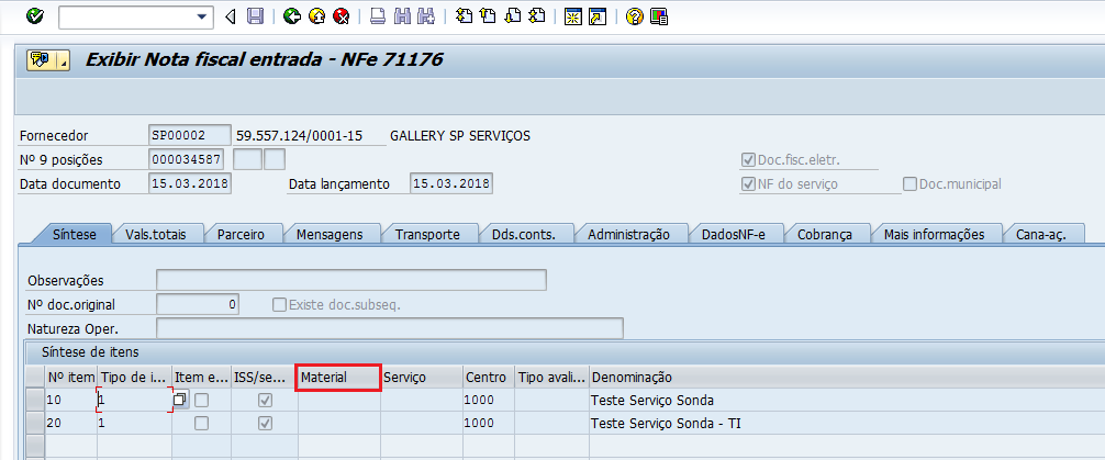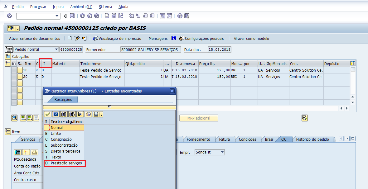 Para atender ao cenário, a categoria do item no documento de compra deverá conter os resultados ‘D’ ou ‘9’ => Prestação de Serviços (tabela standard EKPO, campo PSTYP).