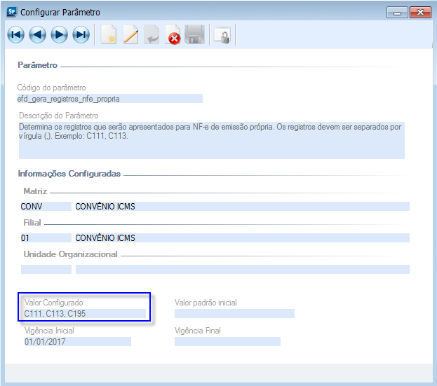 Para a geração dos registros C111 e C195 também será considerado este parâmetro. Os parâmetros efd_gera_registroC111_nfe_propria e efd_gera_registroC195_nfe_propria não serão mais utilizados. Com a atualização desta Nota, as suas respectivas configurações serão migradas para o novo parâmetro.