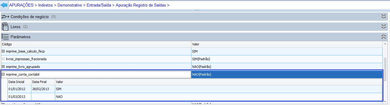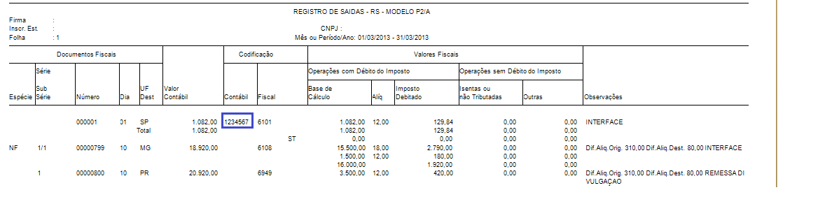 Descrição da Nota: Tratamento efetuado no Livro Registro de Saídas Mod.2 e Mod.2A (Eventual e Oficial), para respeitar o parâmetro: imprime_conta_contabil, quando estiver igual a Não.