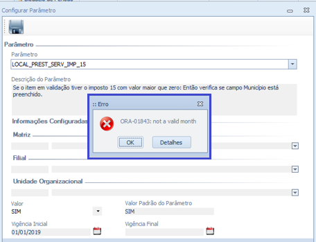 Foi identificado erro na tela "Configurar Parâmetro" ao realizar a configuração dos parâmetros "LOCAL_PREST_SERV_IMP_15" e "REINF_AMBIENTE_TRANSMISSAO". Ao informar a data de vigência inicial o sistema retornava com o seguinte erro: