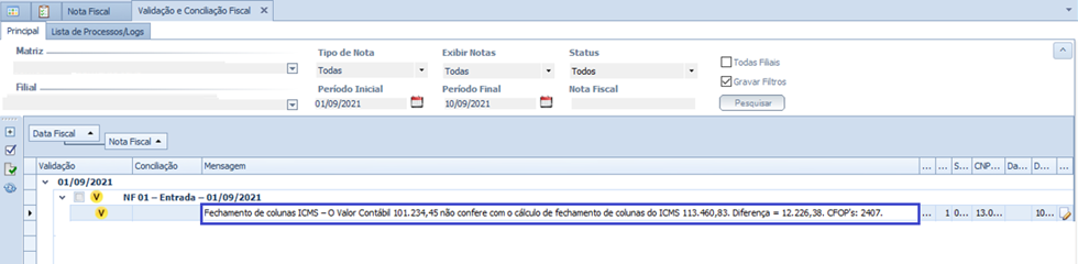 Este cenário também ocorria na tela de Validação e Conciliação Fiscal.