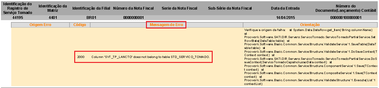 Na execução da Interface de Serviços Tomados foi apresentada mensagem de erro para o campo SVT_TP_LANCTO, conforme demonstrado abaixo: