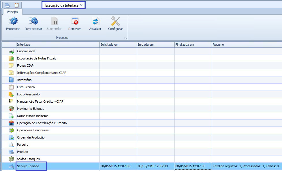Após o tratamento a execução da Interface de Serviços Tomados é efetuada com sucesso, conforme demonstrado abaixo: