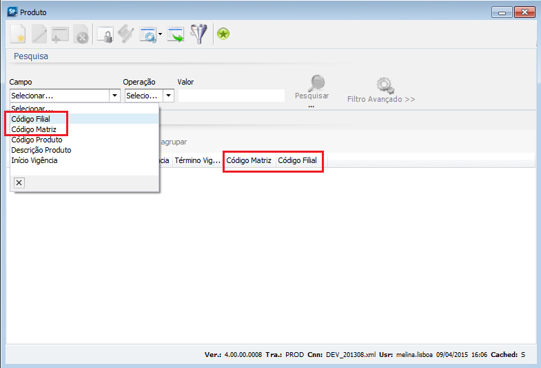 Inclusão dos campos Matriz/Filial na pesquisa e resultado da tela de Produto: