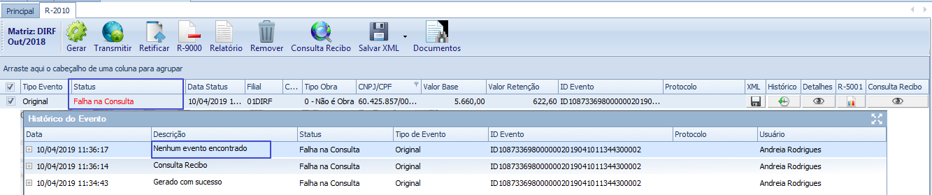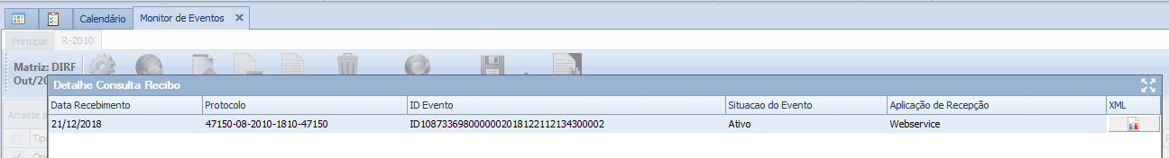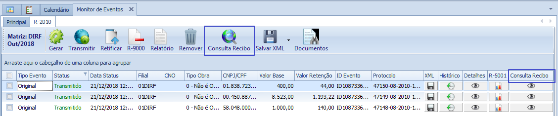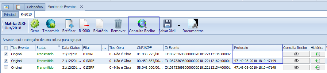 Neste exemplo, para o evento R-2010 período 10/2018, a Consulta Recibo é realizada para um evento que está sem o número de protocolo e outro que possuem o número protocolo.