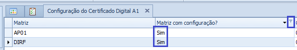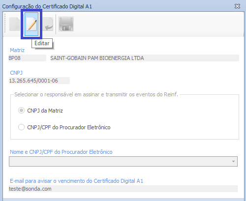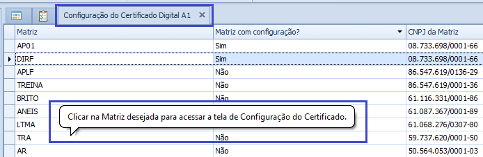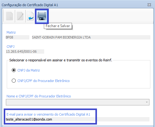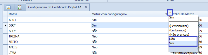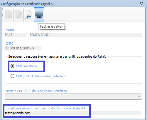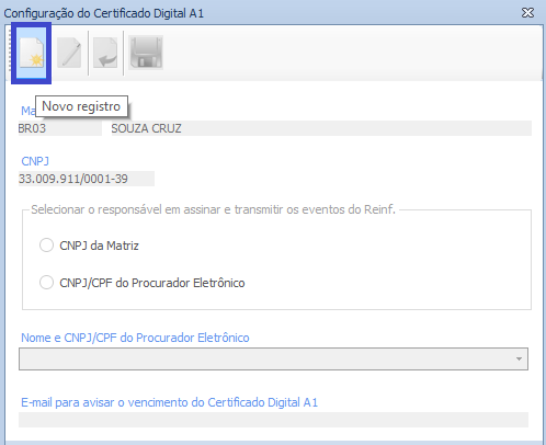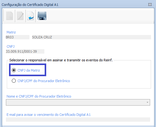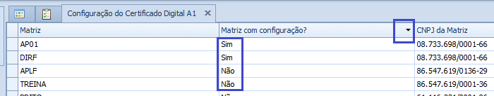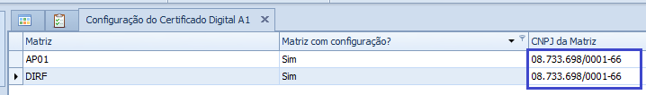 Os dados da tela de Configuração do Certificado Digital A1 são salvos por CNPJ da Matriz.
