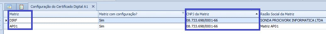 Os dados são mantidos nas tabelas por CNPJ da Matriz. No cenário abaixo, as configurações são iguais para os dois códigos de Matrizes.