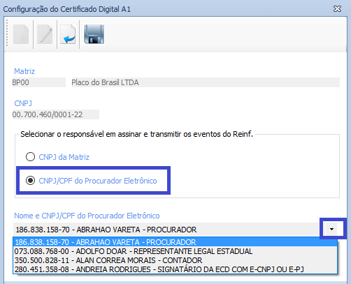 No campo Nome e CNPJ/CPF do Procurador Eletrônico será demonstrada a lista dos Representantes Legais vigentes cadastrados para a Matriz selecionada.