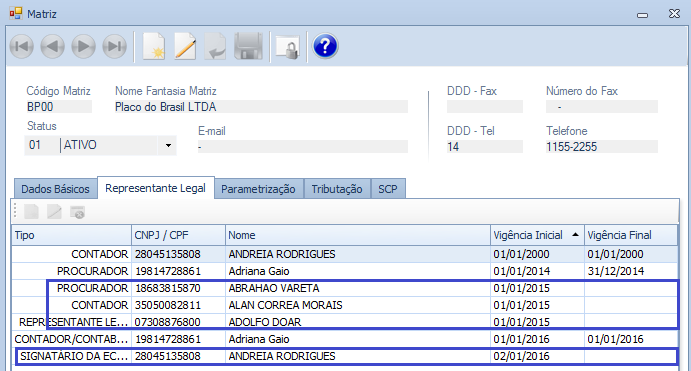 No exemplo da Matriz BP00, acima, foram demonstrados os Representantes Legais vigentes, conforme demonstrados na tela da Matriz, abaixo: