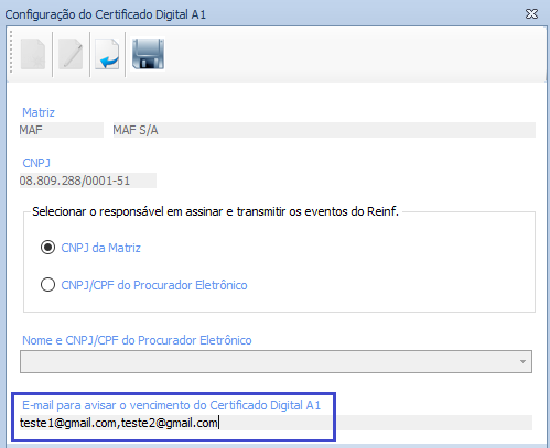 Campo: E-mail para avisar o vencimento do Certificado Digital A1