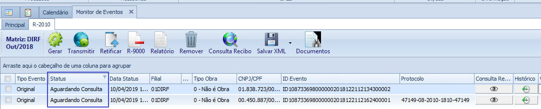 Ao clicar no botão Consulta Recibo, o status dos eventos será alterado para Aguardando Consulta.